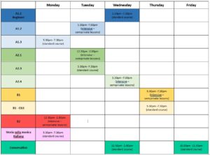 Tutti i corsi seguono il Quadro Comune Europeo di Riferimento e sono disponibili previo raggiungimento del numero minimo di studenti.