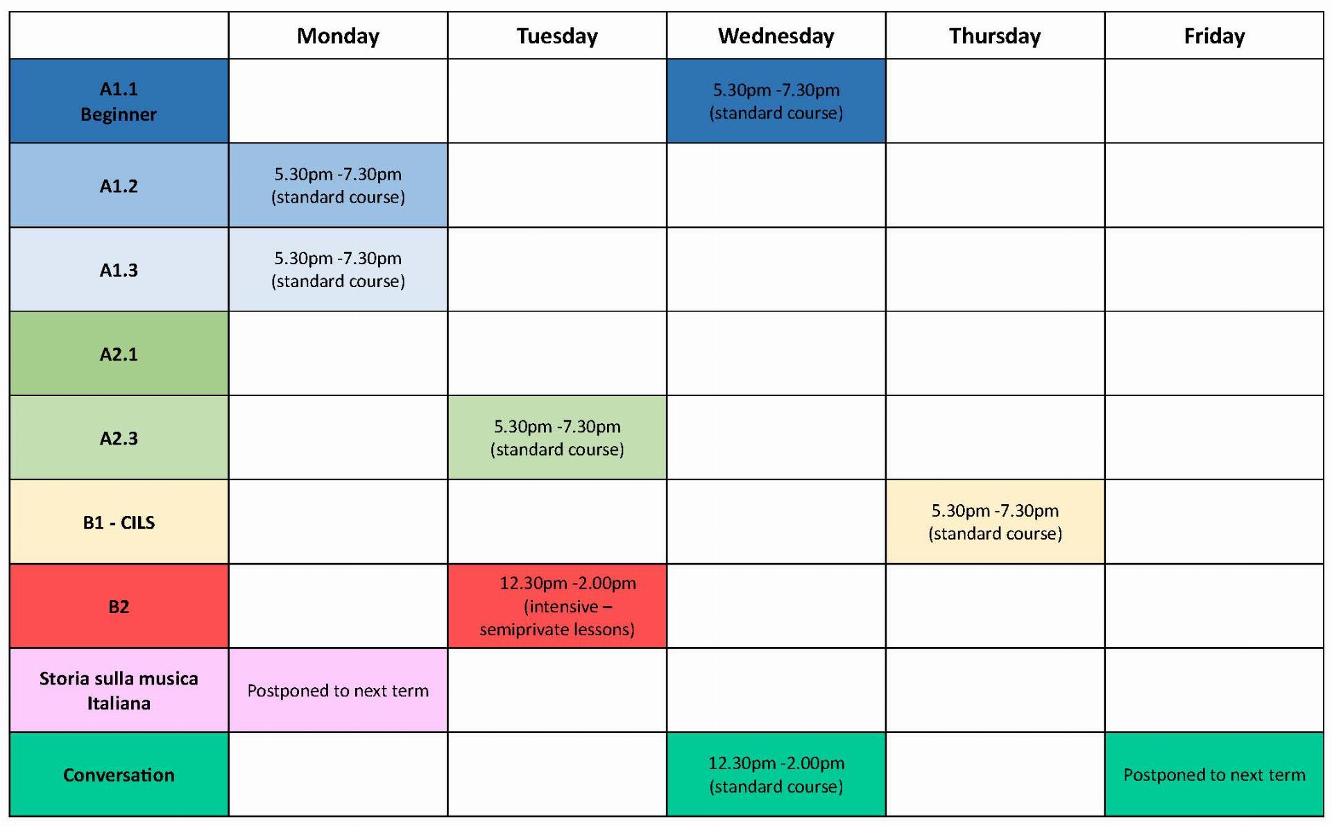 I corsi sono pertanto strutturati in quattro Terms. Gli insegnanti variano ad ogni nuovo corso per assicurare una migliore esperienza didattica.